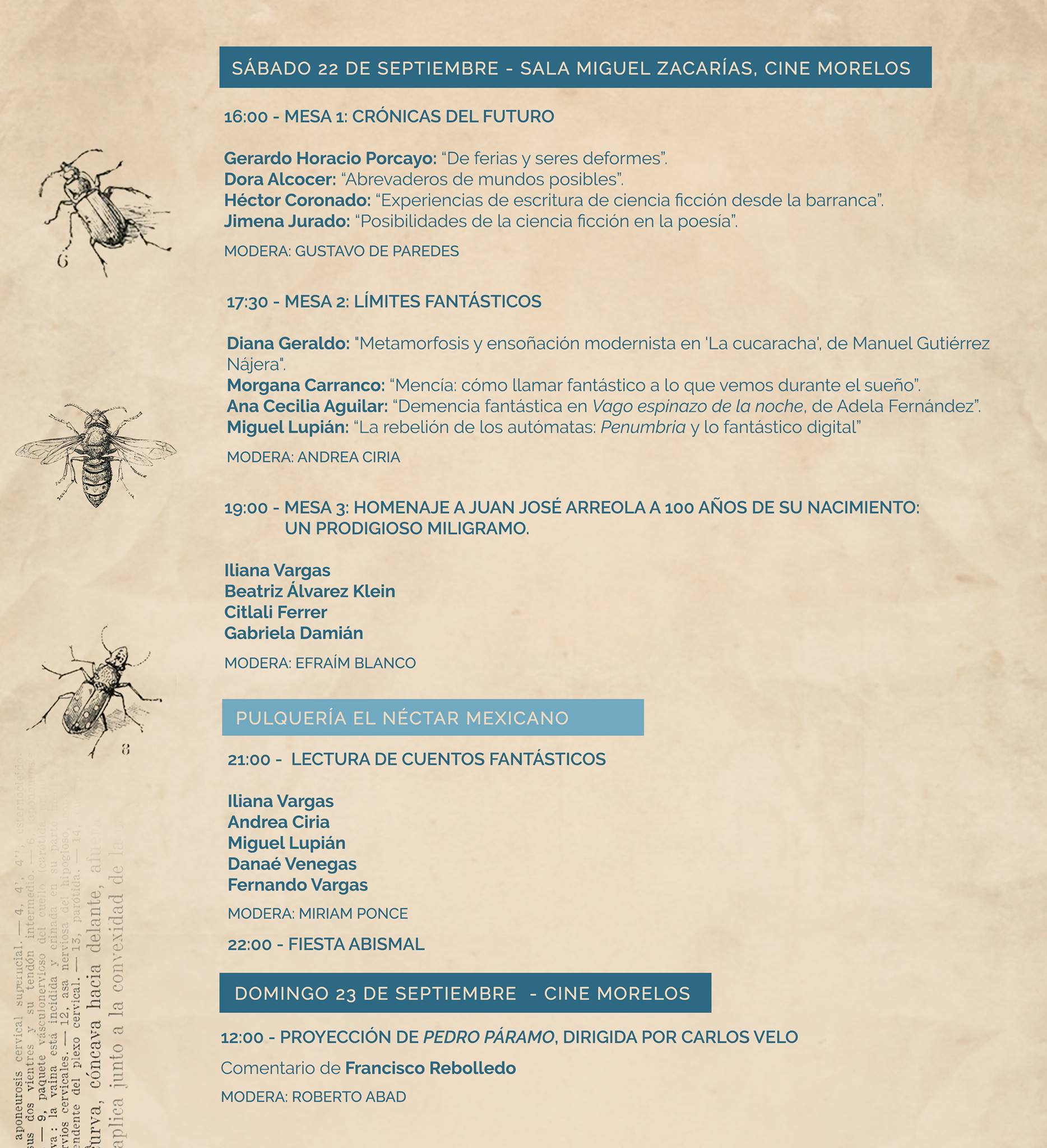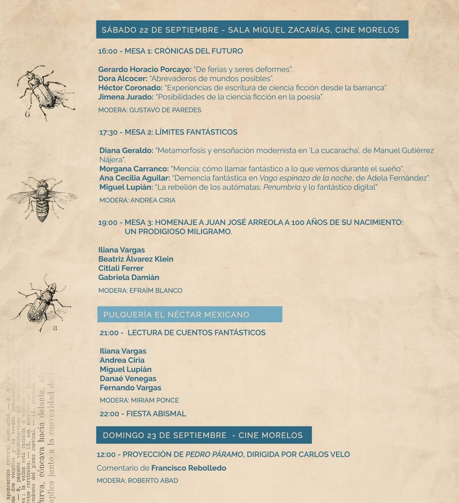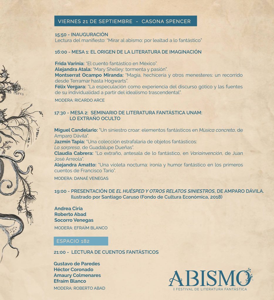 Del 21 al 23 de septiembre de 2018 se llevará a cabo en Cuernavaca, Morelos, la primera edición de Abismo. Festival de Literatura Fantástica, cuyo fin es explorar y difundir la cultura de lo irreal y onírico a través de la voz y la palabra de personalidades que, desde la creación artística, han dejado constancia de ese universo paralelo y extraño.
