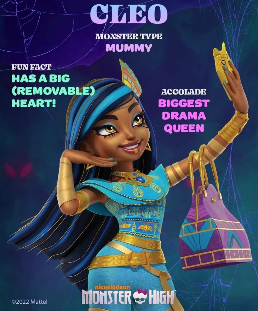 Cleo de Nile es una momia egipcia y es influencer. Debido a que su hermana Nefera es la primera en la línea de sucesión al trono, ella se empeña en ser la reina de las redes sociales, sobre todo de Eektok. Conserva sus órganos en un jarrón, el cual mantiene cerca de ella para no desintegrarse.