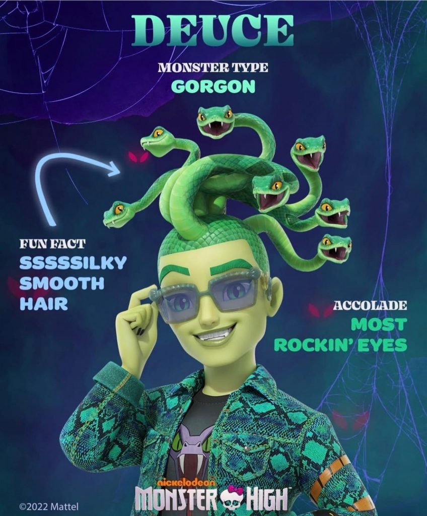 También encontramos lo que al parecer son descendientes de criaturas mitológicas. Por ejemplo, hay un chico llamado Deuce Gorgon (hijo de Medusa Gorgon). Deuce tiene serpientes en lugar de cabello y usa gafas porque puede convertir en piedra a quien lo vea directamente a los ojos. (En griego, gorgon significa “terrible”, por lo que Deuce Gorgon sería alguien “doblemente terrible” o un “diablo terrible”, algo no muy lejano semánticamente al demogorgon de Stranger Things.)