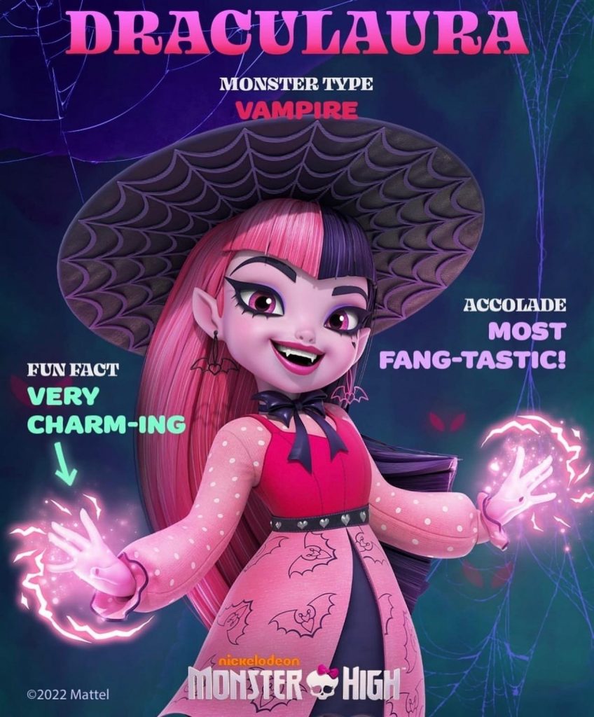 Draculaura es una vampira vegana, pues no se alimenta de sangre humana o animal; su energía la obtiene de su rendimiento académico y de sentirse bien con ella misma. Como otros de su especie, necesita ser invitada para entrar en habitaciones o casas. Le atrae la brujería, pero al principio no puede dedicarse abiertamente a ella, pues está prohibida para los monstruos. Tiene una buena relación con Drácula, su padre, aunque en los primeros episodios no puede decirle que es una bruja.