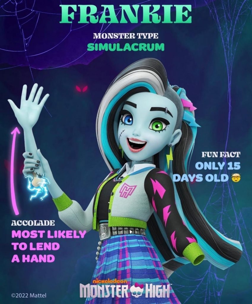 Frankie Stein es une personaje no binarie, es muy inteligente y utiliza el lenguaje inclusivo. Al inicio de la serie han pasado tan solo 15 días desde su creación.