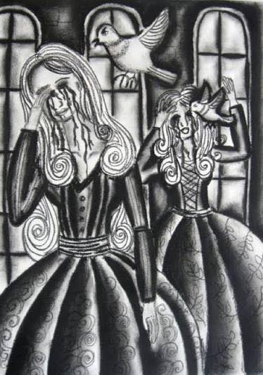 Y, como cereza del pastel, en el atrio de la iglesia donde Cenicienta y el príncipe celebran su feliz enlace, dos palomas les arrancan los ojos a las hermanastras, que «así fueron castigadas a quedarse ciegas durante toda su vida, por malas y falsas». (Grimm, 2022, p. 213)