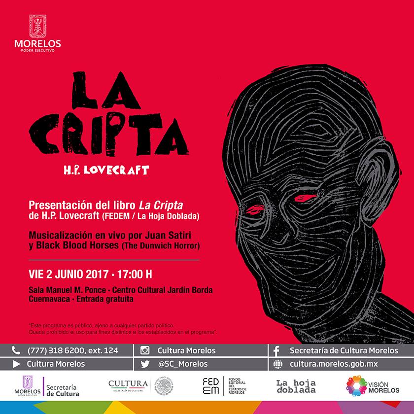 Presentación del libro "La Cripta" de H. P. Lovecraft, de la editorial La Hoja Doblada y el Fondo Editorial del Estado de Morelos (FEDEM), con la participación de Tayde Bautista, Anelée Rosell, Miguel Lupián y Sergio D. Lara. Título original “In the Vault” de Howard Phillips Lovecraft (1890-1937), quien fue un escritor norteamericano de temperamento fantasioso y melancólico. Decía que la emoción más antigua e intensa era el miedo, y que el más antiguo e intenso de los miedos era lo desconocido. Sus cuentos están llenos de mitos, de cosas inexplicables, de seres infrahumanos, de atmósferas asfixiantes. Es considerado uno de los escritores más importantes de la literatura fantástica del siglo XX, pero alcanzó la fama hasta después de su muerte. “La cripta” se publicó originalmente en la revista “Tryout” en 1925. Sala Manuel M. Ponce del Centro Cultural Jardín Borda, Cuernavaca, Morelos.