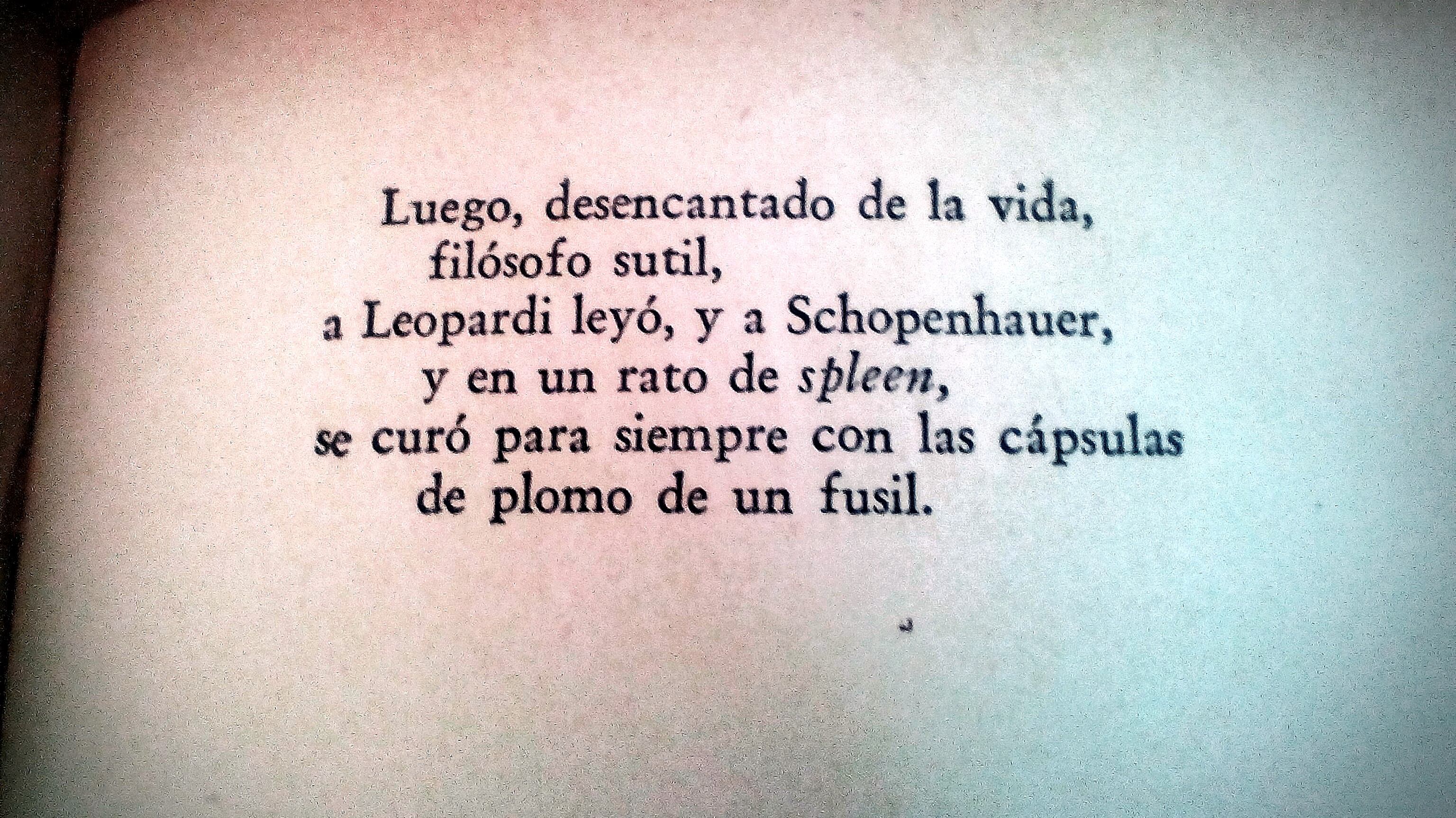 Juan de Dios es un personaje recurrente en sus poemas. Un prototipo de hombre decimonónico, ya romántico, ya mundano; que por lo general padece de amores, o de la capacidad de amar. En este caso el buen hombre termina encontrando la solución a sus problemas con una preciosa analogía entre medicina y muerte. Las balas como cápsulas curativas… Podríamos analizar la presencia de la filosofía alemana de la época; del humor del siglo expresado en la palabra spleen y demás cosas interesantes en cuanto a contenido, pero no viene al caso en este texto.