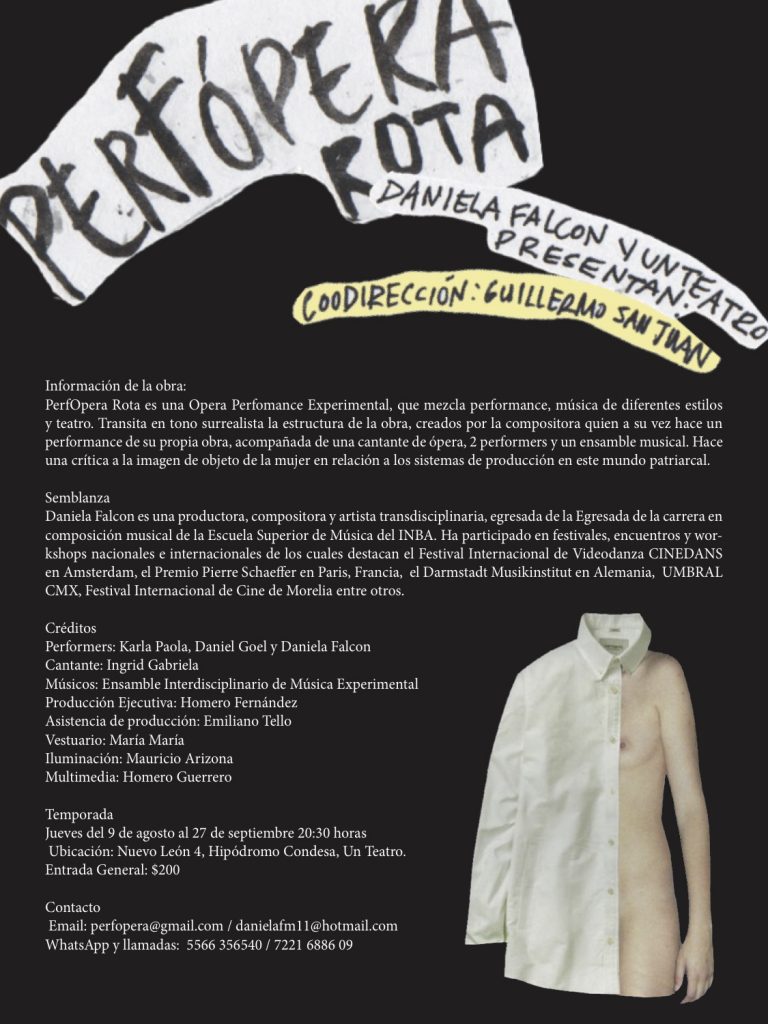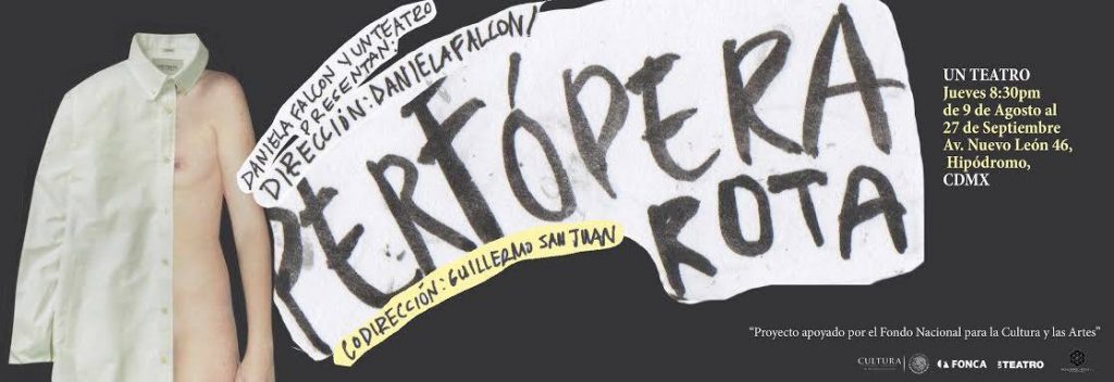 «La Perf-Ópera Rota es una pieza interdisciplinaria en búsqueda de una representación contemporánea, que combina elementos del performance, música y el teatro. Hace una crítica al papel que juega la imagen de la mujer en la actualidad en relación a la sobreproducción (de término capitalista) que existe en nuestros sistemas sociales.