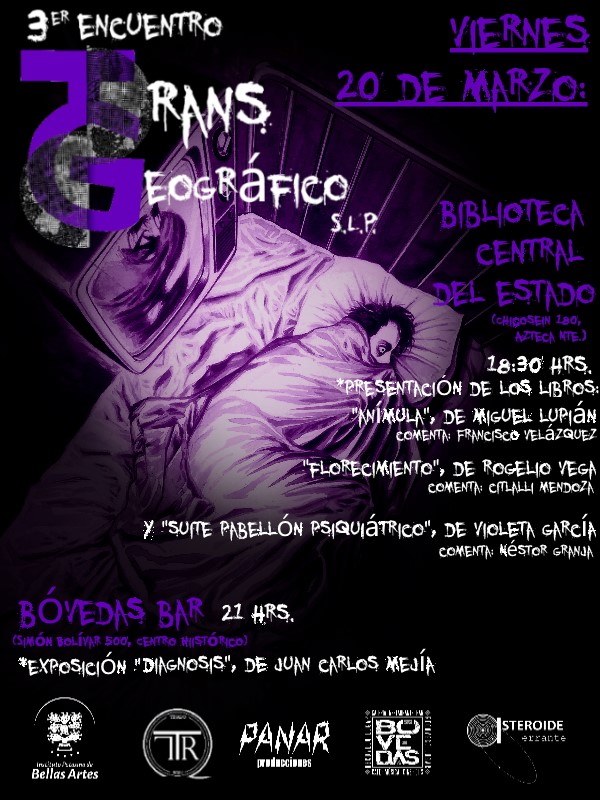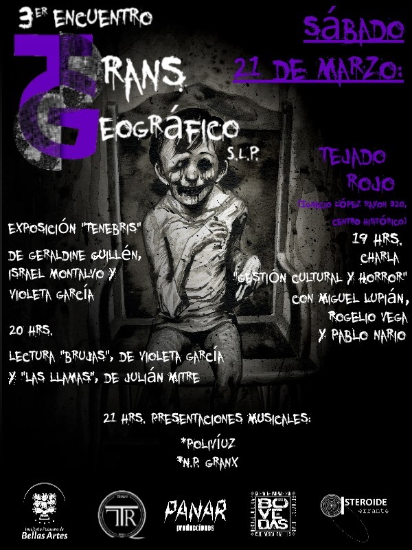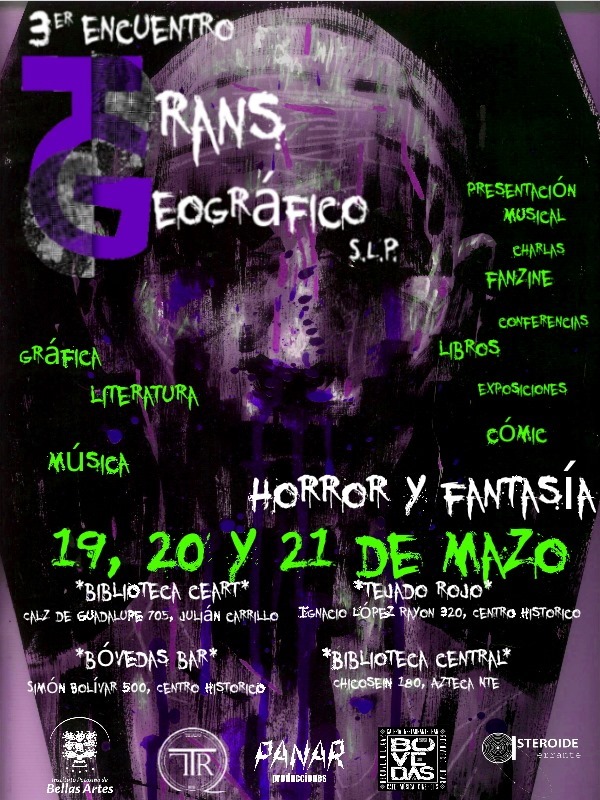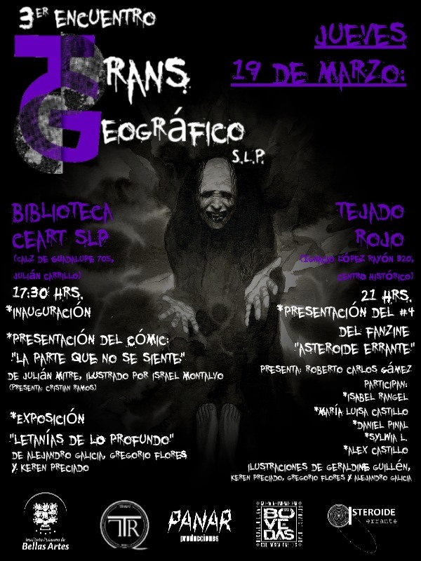 El colectivo Asteroide Errante, un grupo de artistas convencidos de que el arte, al igual que una buena borrachera, es un hecho social que requiere compartir éticas estéticas y cuya principal misión es crear lazos de colaboración entre artistas, disciplinas y lugares, realiza cada año el encuentro TransGeoGráfico, un foro multidisciplinario que busca compartir y conocer las distintas interpretaciones de la realidad a través de la música, la literatura y las artes plásticas. Del 19 al 21 de marzo se llevará a cabo en la ciudad de San Luis Potosí  la tercera edición de este encuentro y el tema central es el horror. Habrá presentaciones de libros y cómics, exposiciones, charlas y música. Este ejercicio de confrontación nos llevará durante un fin de semana a explorar el terror que nos acecha, el terror inconfesable y el terror perpetuo que nos obliga a silbar en el rincón del hedonismo cotidiano para distraernos. En esta ocasión, varias sedes contarán con la presencia de artistas de Guadalajara, Nayarit, Michoacán, Ciudad de México y San Luis Potosí.