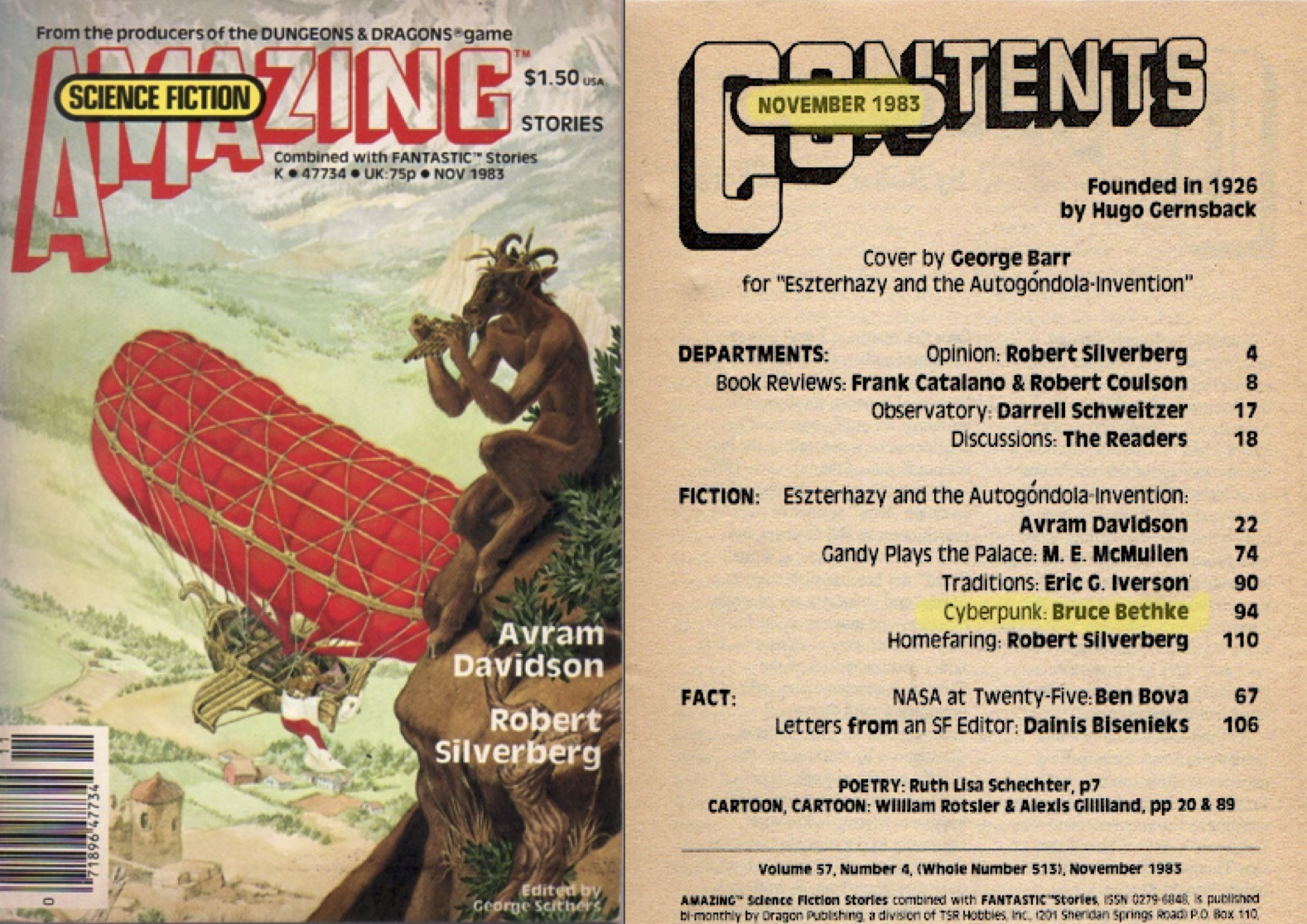 El término cyberpunk apareció por primera vez en la legendaria revista Amazing Stories en 1983: era el título del ya famoso y seminal cuento de Bruce Bethke, que después se editaría en forma de novela corta. El ritmo de Bethke es frenético, con neologismos y circunstancias que no se molesta en explicar. Los héroes son un grupo de adolescentes que ahora llamaríamos hackers, jóvenes cuya vida gira alrededor de una red virtual como espacio seguro para ellos, lejos de la mirada interventora de los padres. Son rebeldes que construyen espacios liminales en las pantallas. Más allá de crear una palabra, Bethke diseñó el mapa y la hoja de ruta para el género completo. Casi podríamos decir que en el cuento/novela de Bethke se reproduce fractalmente todo lo que vendría después.