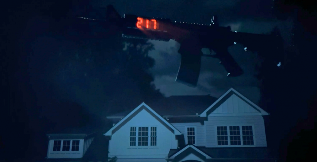 Hasta aquí parece ser una típica película de terrero. Es común el tropo del pueblo tranquilo que esconde una pesadilla, desde Salem’s Lot, pasando por IT y Hereditary. Inclusive se le ha llamado como el género del “gótico suburbano” para referirse a estas narrativas, las cuales, sin duda, uno de sus mejores exponentes es Stephen King. Siguiendo la tradición, algo oculto se encuentra en el pueblo. Aunque no sigue las reglas del gótico suburbano. La convención de este último es que el elemento generador de terror es un elemento antiguo que, en muchas ocasiones, precede al pueblo; ya es parte integral del pueblo. Aquí no es el caso. No revelaré la fuente del terror y la causa de la desaparición, pero el fondo simbólico, si bien no narrativo, se encuentra en un plano. En dicha secuencia el padre de un niño que desapareció tiene un sueño y, en la condición onírica, observa que aparece sobre una casa la imagen de un rifle de asalto; al poco tiempo, el arma se disuelve en nubes nocturnas.